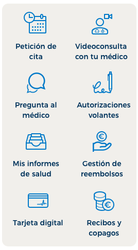 En el área privada Mi Sanitas (disponible en App y web) los clientes pueden gestionar su póliza; solicitar citas online, descargar análisis clínicos, solicitar reembolsos consultar recibos, consultar el cuadro médico…